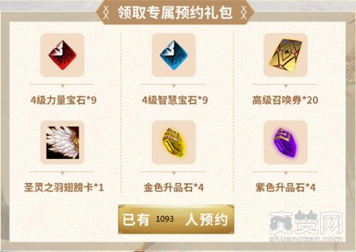 专属预约礼包内容:圣灵之羽翅膀卡*1、4级力量宝石*9、4级智慧宝石*9、高级召唤券*20、金色升品石*4、紫色升品石*4。