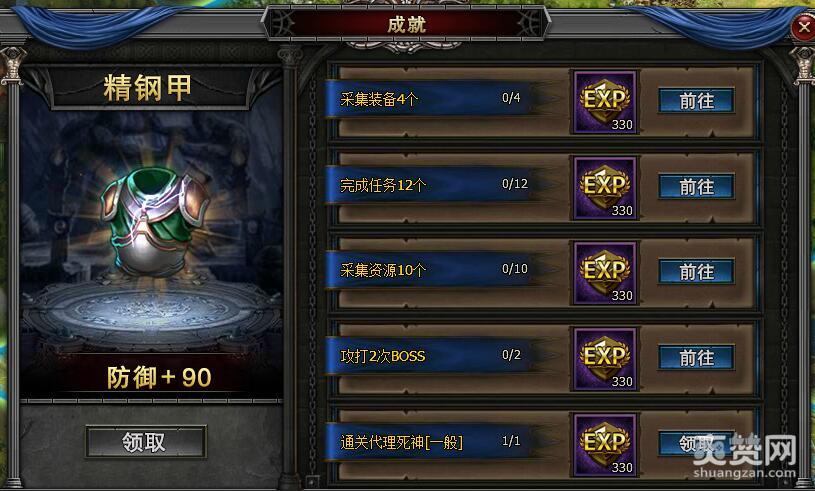 以上五大成就条件达成后,就能领取精钢甲。