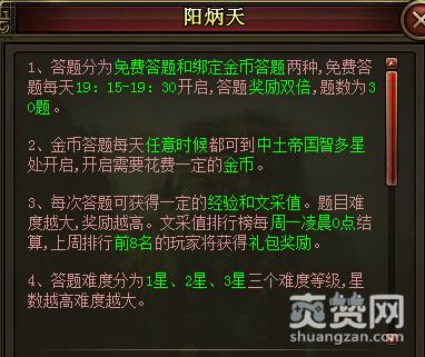 2.任何时候都可以在阳炳天处花费绑定金币回答他提出的问题,可以获得经验和文采值的奖励。题目难度越大,经验越高。