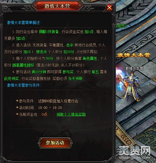 52gg《炎龙传奇》大本营活动会在19:00-19:20开启,达到80级的玩家且加入任意行会都可以参与,在活动内是无视装备和平衡属性的,属性和个人积分有关,积分越高,属性越好!