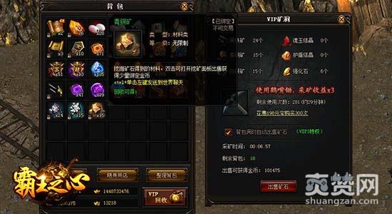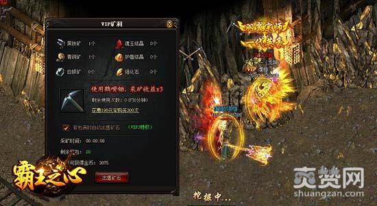 在9cb《霸王之心》的霸王城中找到传送员NPC后,可以选择传送到普通矿洞或VIP矿洞,两种矿洞中可挖到的物品相同,VIP矿洞可以使用鹤嘴锄,采矿获得三倍收益。