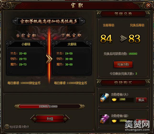 羡慕有权的人吗?不必羡慕啦!你也可以拥有权力哦!在52gg《沙城红颜》官职系统中,小伙伴们不仅可以拥有霸气的头衔还可以领取俸禄哦!官职等级越高增加的属性越多!想要升级官职需要相应的功勋,那么功勋怎么来呢?当然是通过完成日常任务、击杀BOSS和商城购买啦!