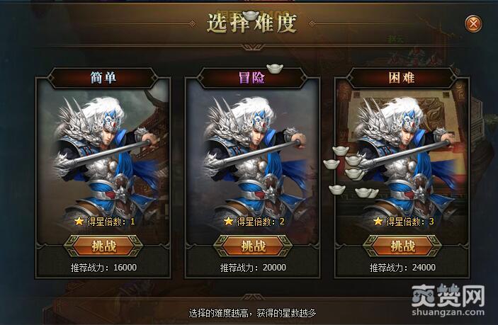第2层的对手是赵云。这里简单介绍下对手难度设定。分为三档,分别是简单、冒险和困难。简单难度下的赵云,得星倍数是1颗星,推荐战力:16000;冒险难度下的赵云,得星倍数是2颗星,推荐战力:20000;困难难度下的赵云,得星倍数是3颗星,推荐战力:24000。
