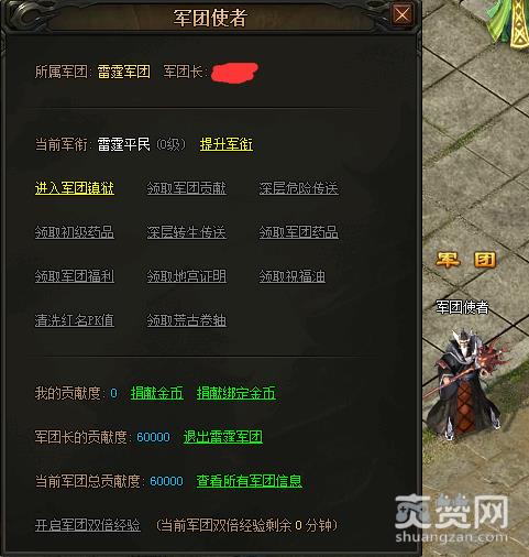 在威龙城-军团使者处可以看到军团玩法的详细。满六十级的玩家可以选择加入雷霆军团、光芒军团、烈焰军团中的任一。有句老话说得好,不想当将军的士兵不是好士兵,加入军团后当然是剑指军团长一职,想要担任军团长就需要有贡献度和军衔,军衔一开始可以通过收集指定装备来提升。军衔提高可以在军团中获得更多的福利,包括军领取军团贡献,军团药品,获得地宫证明,最高等级的军衔还可以领取荒古卷轴。