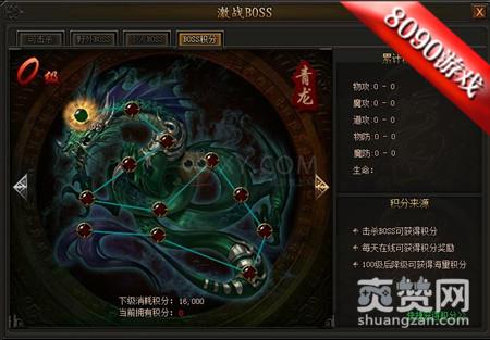 玩家达到60级以上可以通过主界面右上方的激战boss进入boss积分界面,boss积分有青龙、白虎、朱雀、玄武、魔麒麟、魔螣蛇六个阶层,每个阶层分为12个等级每点亮一个魂点,玩家均可获得相应的属性加成,魂点必须依次点亮,不可跳过。当前阶层魂点全部点亮之后,才可进入下一阶层。点亮魂点需要消耗相应数目的BOSS积分。