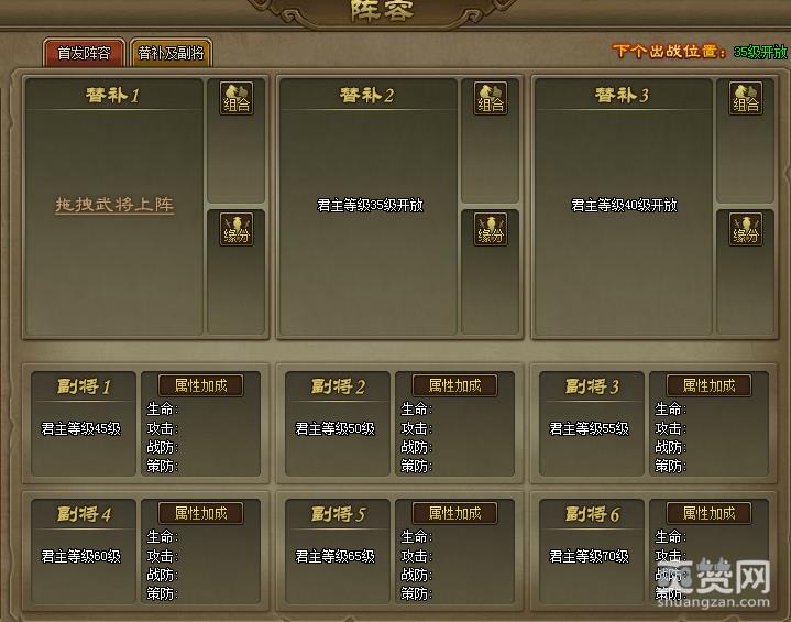 玩家可以搭配自己的武将阵容,每个阵容可以选择6位武将作为首发,3位武将作为替补,以及6位武将作为副将,共可上阵15位武将。首发武将优先上阵,替补武将则是在首发武将死后上场,而副将则只提供附加属性。