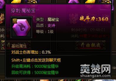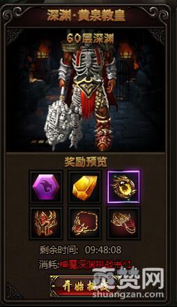 深渊·黄泉教皇进入时需要消耗神魔深渊挑战书1本。挑战书可以在神魔秘境中刷。掉落的宝物分别是(并不是一定掉,有些宝物是含概率掉落的):穿刺·魔秘宝(史诗)、秘宝精华(中)、BOSS精华(中)、至尊战盔(8转)、至尊战链(8转)、至尊战带(8转)。其中最极品的自然属于穿刺·魔秘宝了。作为品质史诗的魔秘宝,它能在PK时给玩家带来对战士伤害增加0.3%的效果。如果打出实属不易,玩家多多珍惜。