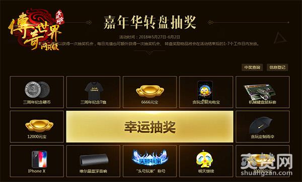 活动就是要送礼。参加贪玩游戏嘉年华签到就送一次抽奖机会和一枚战队币。期间充值10元以上就能在6月2日当天领取三周年特别称号一个。还有嘉年华豪华大礼包来到就送,贪玩《传奇世界》网页版的礼包大家可不要领错了。幸运大转盘专门为无敌幸运的玩家准备好了各种奖品。