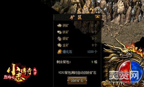 在游戏中,矿石可通过回收功能来获得一些金币奖励。在9377小志传奇中,VIP2或以上的玩家可以享受背包满时,自动回收矿石功能。除此之外,成为VIP还有很多较为方便快捷的专属功能等你发掘,当然啦,还有专属buff等好处哦。