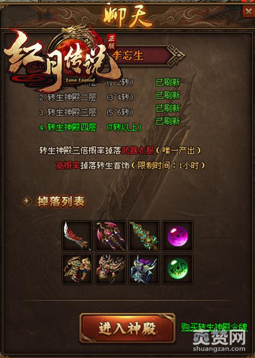 转生神殿共有4层,转生神殿一层(1-2转),转身神殿二层(3-4转),转身神殿三层(5-6转),转身神殿四层(7转以上),在51《红月传说》转生神殿内藏有许多不为人知的宝藏,最高可以获取7转武器衣服,还有8转的饰品呢。大家击杀神殿内的魔王即可有机会获得宝物。