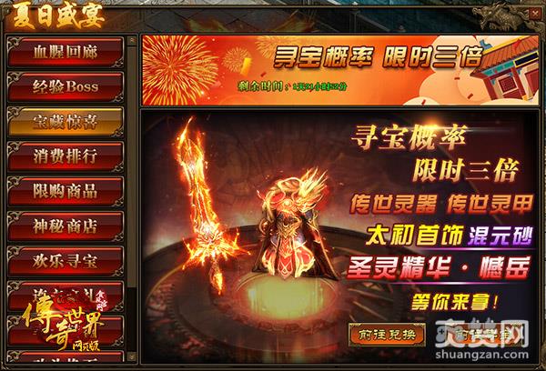 夏日盛宴,酷爽来袭。盛大的庆典怎么能少的了游戏活动。血腥金牛魔限时双倍概率掉落传世灵器碎片,这个血腥回廊副本精彩不容错过。还有限时三倍概率的寻宝,太初首饰,混元砂就在这里,圣灵精华·憾岳可以洗练铭文技能类型和品质,紫色的铭文正在跟大家招手。