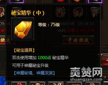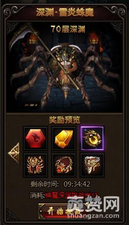 深渊·雷炎蛛魔进入时需要消耗神魔深渊挑战书1本。挑战书可以在神魔秘境中刷。掉落的宝物分别是(并不是一定掉,有些宝物是含概率掉落的):穿刺·魔秘宝(卓越)、秘宝精华(中)、BOSS精华(中)、天启战盔(10转)、天启战链(10转)、天启战带(10转)。其中最极品的自然属于穿刺·魔秘宝了。作为品质卓越的魔秘宝,它能在PK时给玩家带来对战士伤害增加0.4%的效果。如果打出实属不易,玩家多多珍惜。