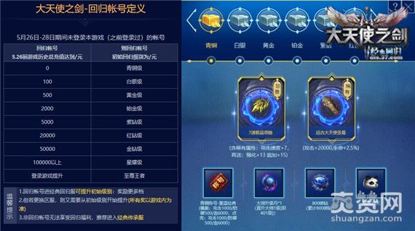 在37《大天使之剑》回归账号活动中,符合条件的玩家,可根据自己在5月26日前的充值免费领取对应档次的奖励,回归账号进入回归服,可提升初始级别,领取更多档奖励,但如果更换区服,则又需要从初始级别开始提升,下图则为金额和档次的对应表。