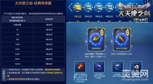 上述即是37《大天使之剑》特别为老玩家准备的活动,除此之外,游戏还准备了所有玩家都能参与的经典传承活动,该活动不分回归与非回归账号,只要你进入任一传承服提升会员级别,均可领取对应档次的奖励,但如果更换区服,则又需要从初始级别开始提升,奖励以及所对应的会员级别如下图。