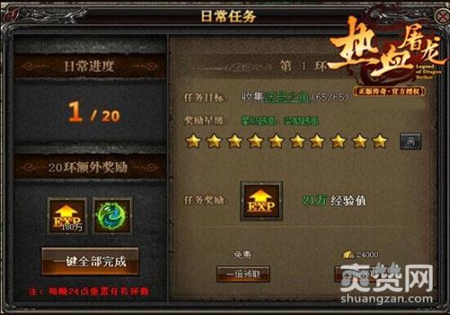 萝卜玩《热血屠龙》玩家等级达到30级之后,会自动接到系统给予的日常任务,每日可以完成20环的日常任务,每日24:00重置环数。日常任务根据玩家的等级不同,可以接到的任务种类、任务奖励均不同。