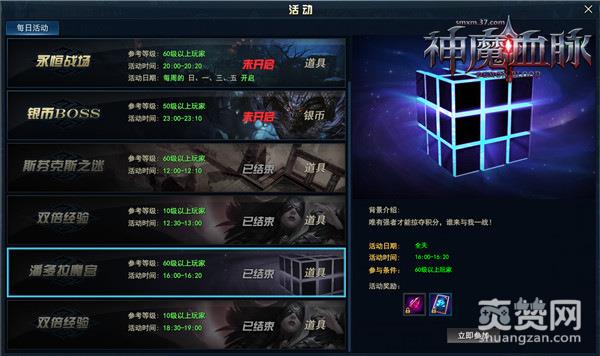 考验你的智力的时刻到啦!只要玩家在37《神魔血脉》解开千古谜团,即可获得财宝!活动开始后,系统将提出问题,玩家需通过站立在不同答案区来选择答案,回答错误的玩家将会被变木乃伊惩罚,答题时,玩家如果对某道题的答案非常自信还可以追加奖励,如果你的答案是正确的,可平分奖池,积分越高获得的奖励越多。