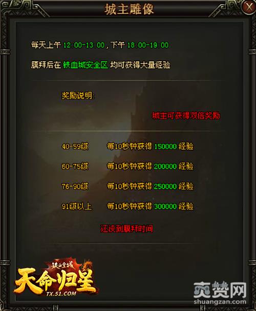 游戏出于人性化考虑,将膜拜城主的时间设置为每天12:00-13:00;18:00-19:00。玩家们可以在用餐期间安心挂机,满足40级的玩家在比奇城安全区即可每十秒获得一次海量经验。没有什么比站在安全区升级更舒服的事情了。