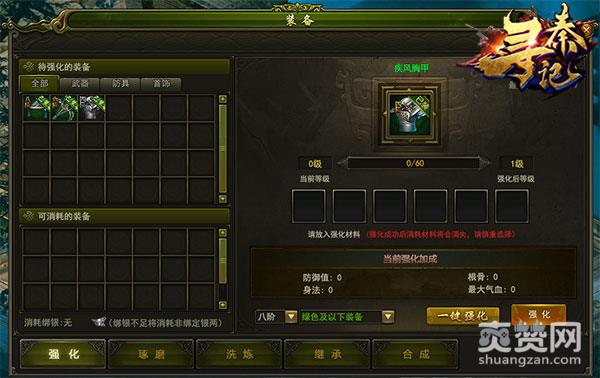 玩家通过消耗低阶装备和少量绑银可对装备进行强化,强化后的装备将获得新的基础属性值。玩家还可通过琢磨获取装备属性,装备琢磨和装备强化类似,但提升的是装备整体属性百分比,即基础属性与强化属性之和。装备琢磨无等级上限,但性价比较低。