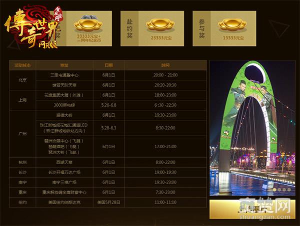 这份对传奇游戏的爱要让全世界都知道。北京、上海、广州、杭州、济南、长沙、南宁、重庆,甚至还有美国纽约,将地标建筑染绿打出我们贪玩游戏的名号,是献给大家所有传奇玩家最好的礼物。《传奇世界》网页版的朋友们记得看到了要拿起手机拍下来,333333元宝和三周年纪念币等你来拿。