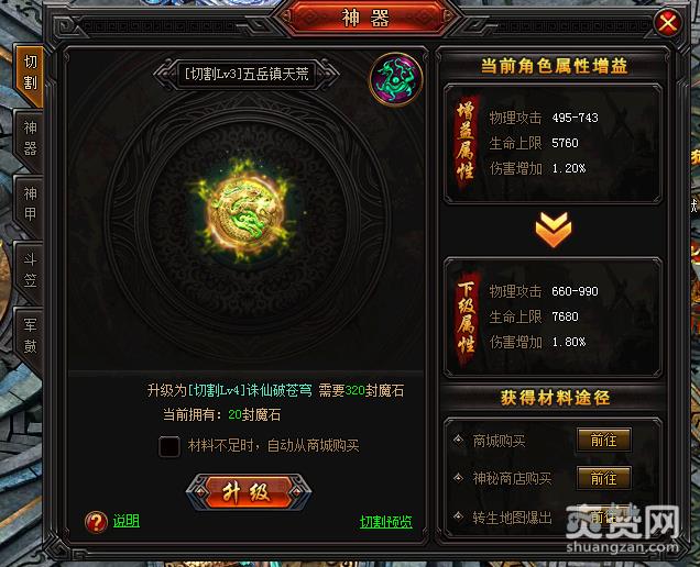 首先给大家介绍52gg《炎龙传奇》的神器系统,神器功能包括:切割、神器、神甲、斗笠、军鼓。切割:能提升切割概率和切割伤害;斗笠、军鼓:升级可获得大量属性;而神器、神甲:可以获得海量属性加成,并且具有炫酷外观,可以通过神魂升级,神魂完成日常收集任务可以获得。