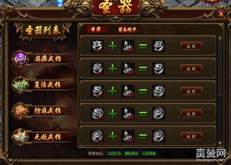 最后需要谅解52gg《炎龙传奇》的圣器系统。圣器包括:麻痹戒指、复活戒指、防麻戒指、无敌戒指,可以通过圣器界面消耗材料合成更高级的圣器。麻痹戒指:攻击敌人时候有概率麻痹敌人;复活戒指:死亡时可以立即复活;防麻戒指:抵御麻痹效果;无敌戒指:被攻击时有概率进入无敌状态;这里比之前的传奇类游戏多了一个类型的戒指,大家要引起重视。