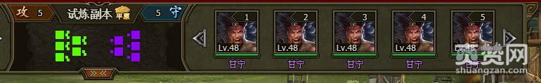 我们试着挑战一下困难难度的甘宁,进入战场,战场地形是城池,对手是5个甘宁48级。