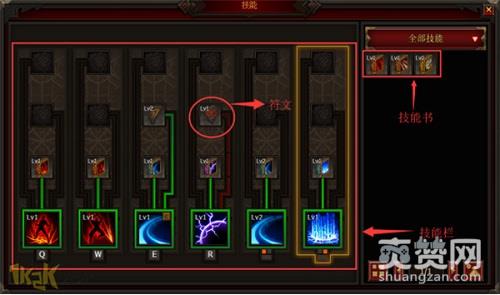 1k2k《圣剑神域3D》技能系统主要可分成两个部分,左侧的技能栏和右侧的技能库。技能栏中有6个技能位,每个技能位可放置1本技能书和2个符文。技能库中放着所有未装备的技能书和符文,玩家可将这些技能书或符文拖到技能栏对应的位置上。不过有一点需要注意的是技能书和符文的位置是不一样的,玩家可根据图标来确认位置。