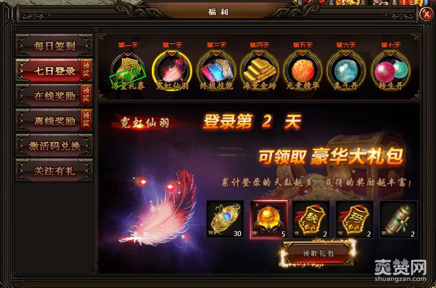 登录第一天,可领取豪华大礼包。领取的道具有:588礼券*6、超级经验玉*5、黑铁矿*20、副本卷轴*2、神魔秘境通行证。