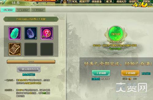 玩家每天的43u《剑道仙语》伏魔任务是完成15环日常任务,每完成一环任务可累积经验多倍领取额外奖励,一键完成需要黄金特权才可以使用,VIP3还可以2倍领取奖励哦!每天0点会重置储存经验。