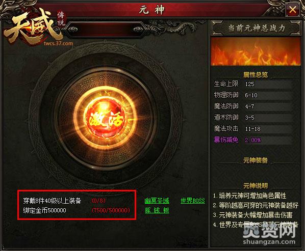 玩家满足“穿戴8件40级以上装备”和“绑定金币500000”两个条件即可激活元神系统。其中40级以上装备可通过幽冥圣域、世界BOSS活动获得,绑定金币可通过摇钱树活动获得。