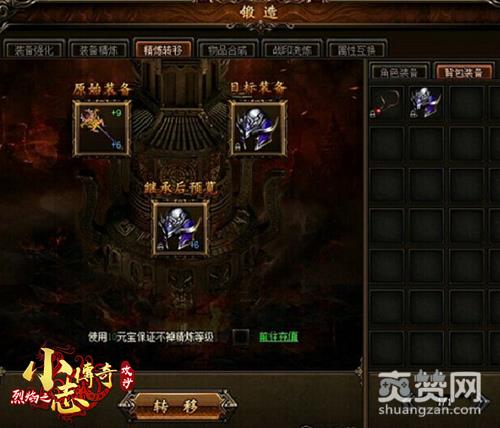 在游戏里,9377小志传奇玩家可对角色身上的装备进行转移,也可对背包内的装备进行转移。而仓库内的装备无法参与转移,玩家可提前将之移至背包内而装备精炼转移要求目标装备的精炼等级必须为0,原始装备的精炼等级一定要大于0,否则无法进行转移。