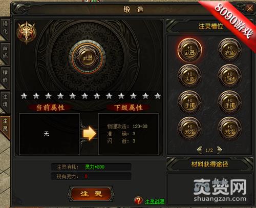 打开8090《散人传说》锻造界面,我们可以看到本次新增的注灵按钮,点击一下就可以看到注灵玩法的界面了。现在我们全身的装备中,一共有武器,衣服,头盔,项链,两个手镯,两个戒指,以及腰带跟鞋子是个槽位可以注灵。每个槽位注灵以后增加的属性都是相同的。