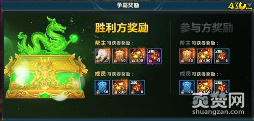 参与争霸的所有成员会获得初级帮会令*50、绑定元宝*240、二级宝石袋*8,帮助会获得城主专属坐骑、城主独特称号以及披羽白玉龙、高级帮会令*50、绑定元宝*300、三级宝石袋*3。失败方也会获得相应的奖励哦!