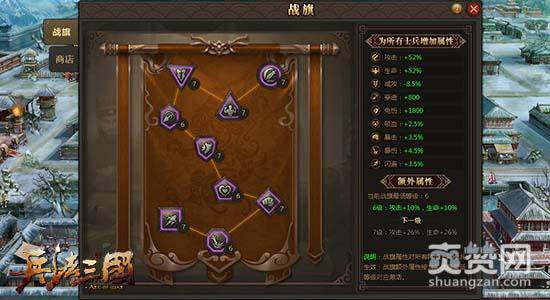 战旗中所获得的能力提升将为所有士兵增加属性,每种能力均可进行升级,升级后士兵所获得的属性也将相应加强。当九种能力同时达到某一等级时,将激活额外属性,共同等级越高,能获得的额外属性也越多。