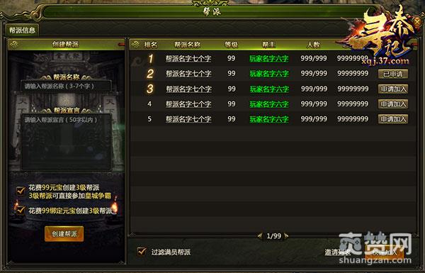 正所谓众人拾柴火焰高,既然同为江湖中人,则必当齐心协力,征讨四方,共同闯出一片属于自己的天地。在37《寻秦记》中,帮派就是这样一个地方,汇聚天下英豪。玩家达到一定等级后便可进入帮派系统,加入一个已有的帮派,甚至自己创建一个帮派。