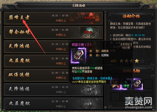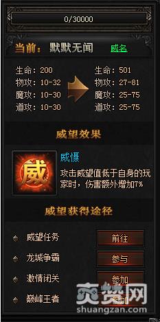 每天0点根据当前威望等级扣除一定威望值,威望值不足时将自动降级。攻击威望值低于自身的玩家时,伤害增加7%。威望值排名前三的玩家可获得特殊称号,并获得在威望界面中展示角色形象的特权。玩家可通过完成日常威望任务,参与龙城争霸、激情闭关、巅峰王者活动获得。