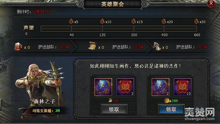 在XY游戏《列王争霸》之中,每周我们在上面的图标栏中都会看到一个英雄聚会的图标,点开来之后就是一个英雄聚会窗口。里面规定了多少时间之后出现一波护送部队。玩家击败这些部队之后,然后可以用击败部队后掉落的美酒、画作或是宝马来兑换相应的奖励,达成一定声望更是能领取额外的幻影笔记奖励。下面我们就来看看这个系统都有哪些奖励,供大家参考。