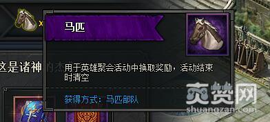 马匹:用于英雄聚会活动中换取奖励,活动结束时清空。获得方式:马匹部队。