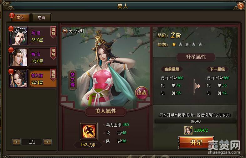 2阶1星升星到2阶2星时,兵力上限提升80,变为640;攻击提升8,变为64;防御提升6,变为48。