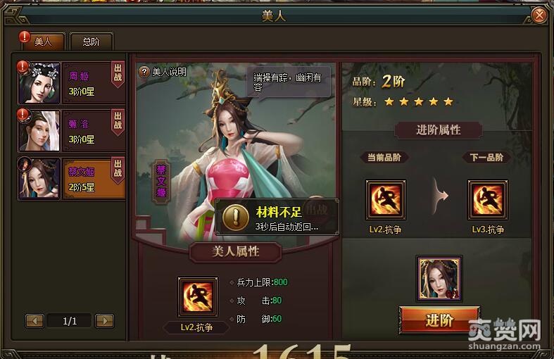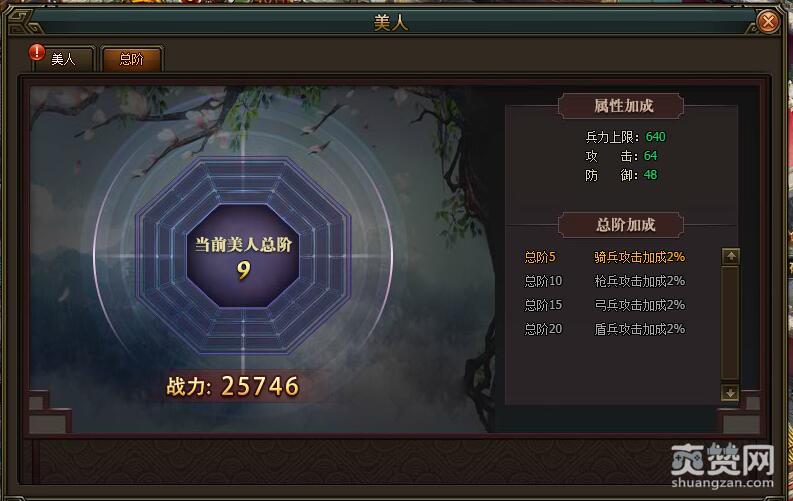 进阶成功后,当前美人总阶会往上提升1阶,小编目前总阶达到9阶,战力提升到25746。属性加成方面——兵力上限:640(提升80),攻击:64(提升8),防御:48(提升6),同时激活骑兵攻击加成2%的效果。