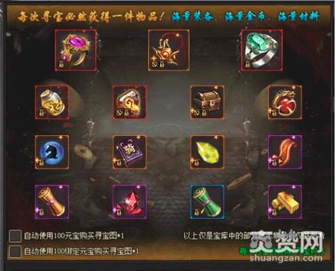还有一个途径可以助玩家获得装备,那就是寻宝啦!每次寻宝必然会获得一件物品,物品包括海量装备、海量金币和海量材料哦!如果没有藏宝图可以使用100元宝来购买寻宝图哦!土豪请随意哈!