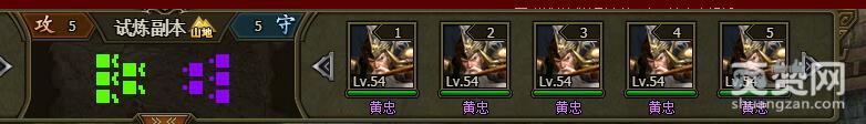 我们试着挑战一下困难难度的黄忠,进入战场,战场地形是山地,对手是5个黄忠54级。(注意:这里关卡敌方武将都是随机的,可能我出的是黄忠,你们出的是吕布,下同)