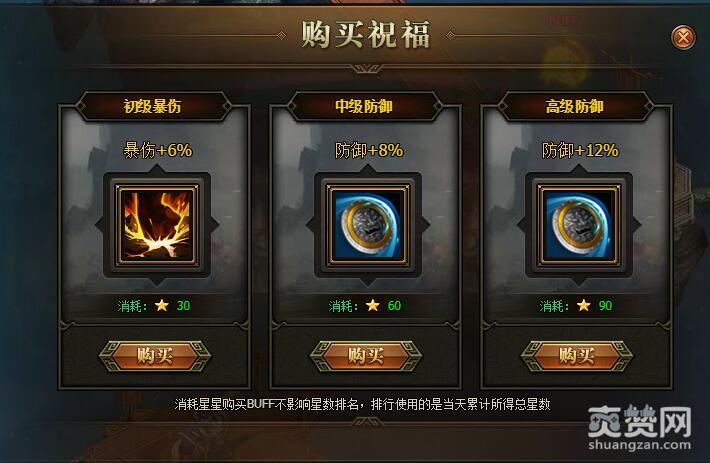 第18管是购买祝福,提供三个随机祝福购买,分别消耗星星数30个、60个和90个。越是消耗多的星星数,越是BUFF效果好。