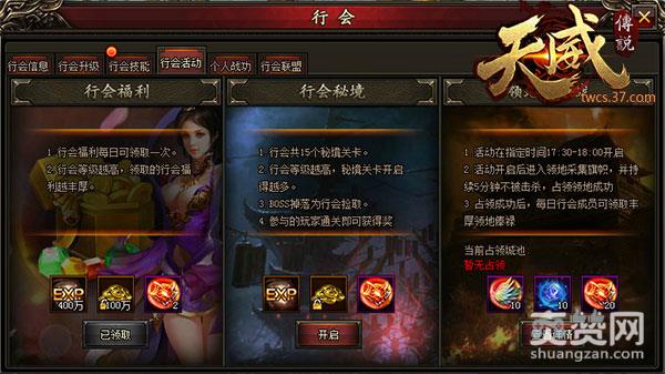 行会秘境只有行会会长或副会长才能开启,开启后行会所有成员都能参加。行会秘境一共有15层,行会等级越高,秘境关卡开启得越多。领地争夺战在指定时间17:30-18:00开启。活动开启后进入领地采集旗帜,并持续5分钟不被击杀,即成功占领领地。占领领地成功后,每一日行会成员均可领取丰厚的领地俸禄。