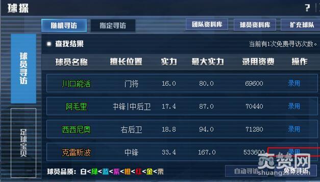 精英招募赢取世界最强球员,玩家可以通过球探界面花费金币来寻找新的球员,球员等级分为八个品级从白色到栗色阶级越高属性越强,每日可以免费寻访2次,超出的次数可以使用20W欧元进行寻访,还可以设置寻找栗色成员,只找你喜欢的超级球员!