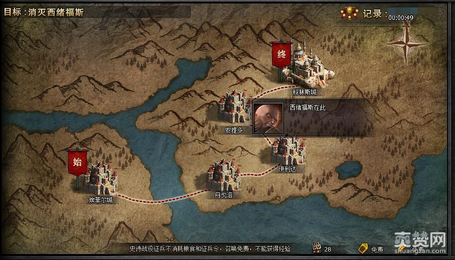 一开始,我们的武将会在起始点处诞生。也就是在埃菲尔城。目标是要占领科林斯城。行进路线方面,需要通过丹戈洛、伊利达、安提多。这三个城市都被敌方重兵把守。