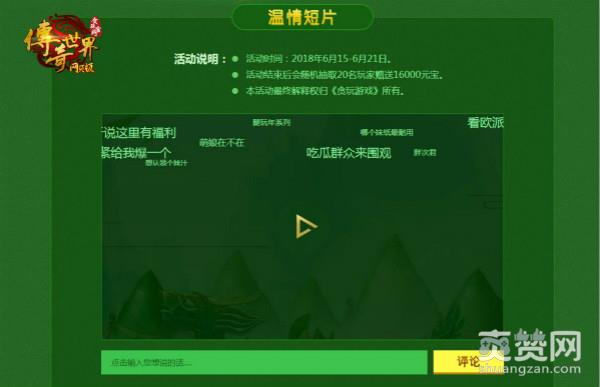最近好事连连,活动多多,有世界杯,有父亲节,还有传统佳节端午节。从今天开始,进入贪玩游戏官网页面,就可以参与端午节的各种活动啦,当然福利是少不了的。签到就可以获得积分,从今天开始到21日都参与短片视频的留言活动,活动结束后会随机抽取20名玩家赠送16000元宝!