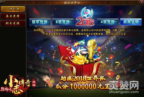 百万元宝,助威2018俄罗斯世界杯。每个人心中都有着一直冠军队伍,而在9377小志传奇疯狂世界杯竞猜活动的“一猜到底”中,在指定的活动时间期间,选出自己心目中的世界杯8强、4强以及冠军队伍。一旦竞猜成功,即可瓜分奖池当中的百万元宝!