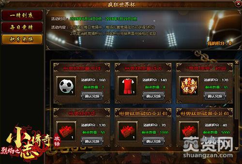 9377小志传奇疯狂世界杯竞猜活动“每日竞猜”获得的积分,可用来兑换到十几倍限量足球和球衣、“章鱼保罗”限定称号、世界杯限定时装,以及各种品质的世界杯助威礼包。
