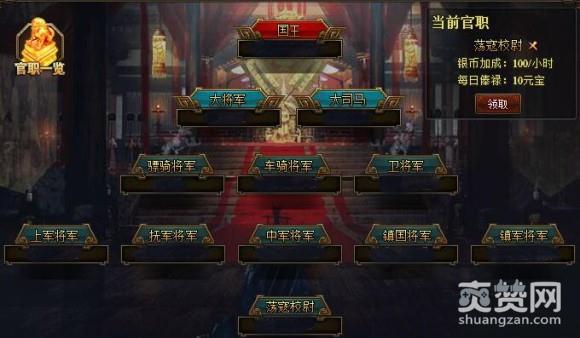 在百将天下国家功能中,有着十分完善的官职系统,从荡寇校尉→中军、镇国、镇军、上军将军→骠骑、车骑、卫将军→大将军、大司马→国王层层递进,能够享受到的特权都不同,成为过往之后就可以号令群雄参与国战,享受多种特权和加成。游戏内的国王一位向来是有能者居之,只要自己能够在对战中打赢国王,便可取而代之,但这可并不是一件简单的事,毕竟能当上国王的人都是有两把刷子的,我们需要做的就是不断的提升自己实力,厚积薄发之中,决胜千里之外。